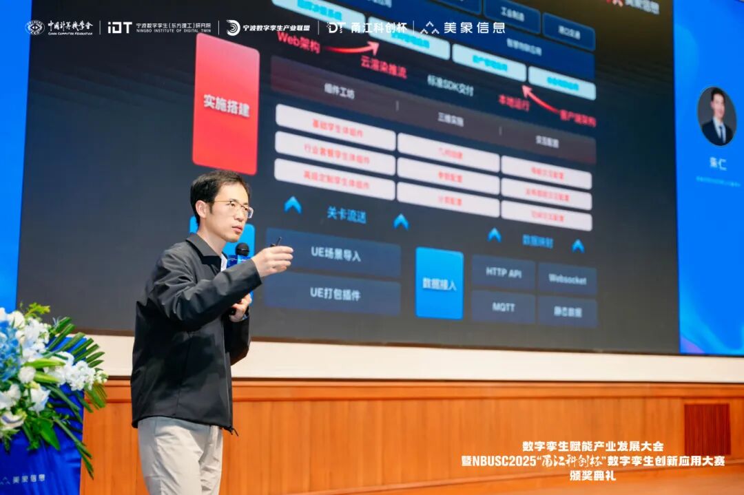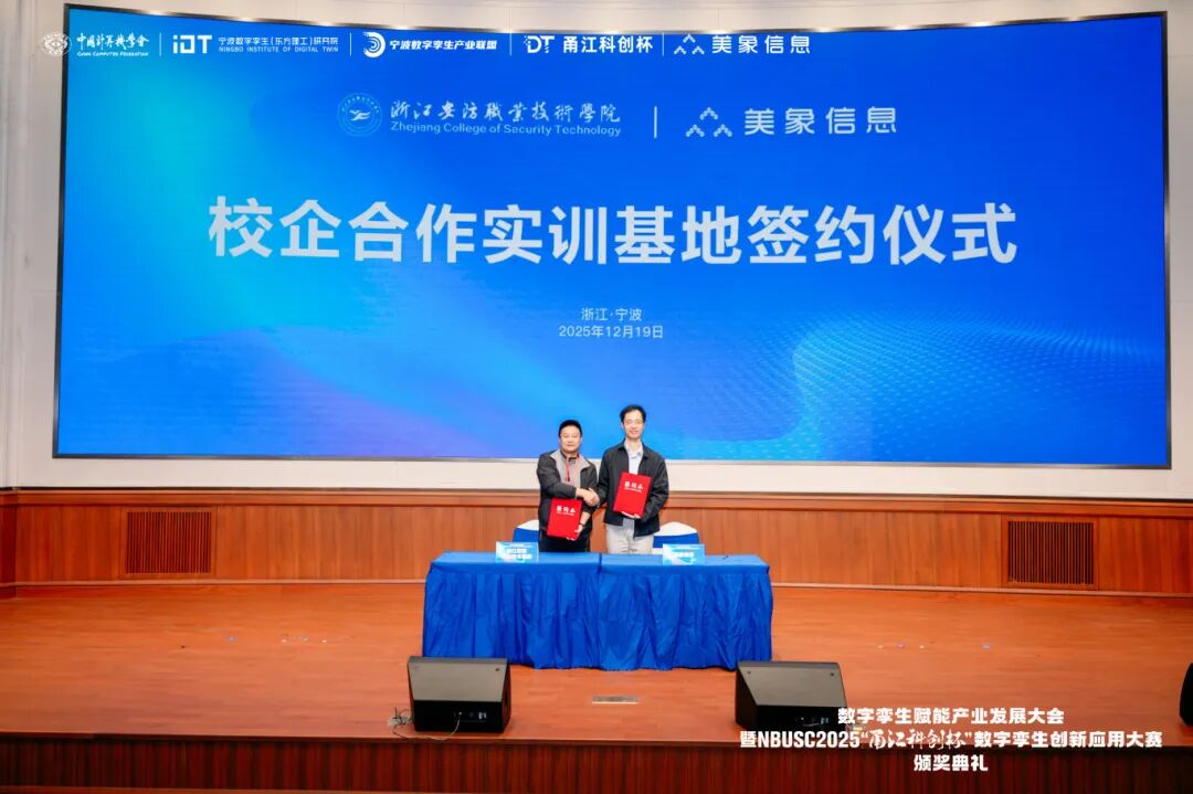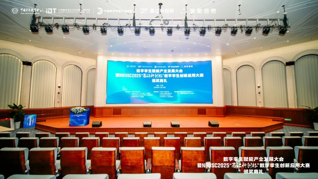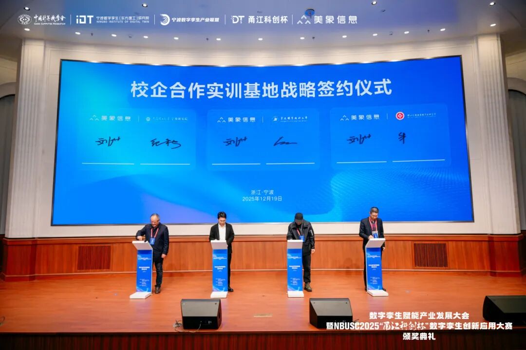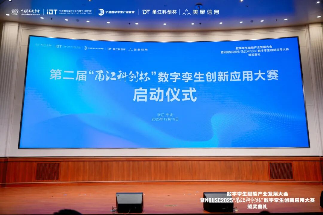 2025年12月19日,数字孪生赋能产业发展大会暨NBUSC2025“甬江科创杯”数字孪生创新应用大赛颁奖典礼在宁波东方理工大学隆重举行。本次大会由中国计算机学会、宁波数字孪生(东方理工)研究院、宁波市高校大学生软件设计大赛组委会、宁波数字孪生产业联盟主办,美象信息科技有限公司、中国计算机学会宁波分部承办,宁波市计算机学会、宁波市大数据发展协会、宁波市软件行业协会、宁波市软件人才创新基地等单位联合支持。
