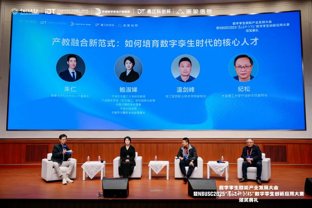 技术的落地与迭代,离不开人才的持续供给。随后进行的“产教融合新范式:如何培育数字孪生时代的核心人才”圆桌论坛,由美象信息董事长朱仁主持,宁波东方理工大学研究教授、宁波数字孪生(东方理工)研究院院长助理、中国计算机学会理事、宁波分部主席鲍淑娣女士,浙江安防职业技术学院副校长、党委委员温剑峰先生,大连理工大学宁波研究院副院长纪松先生等嘉宾结合各自院校与平台的实践经验,围绕校企协同、复合型人才培养、产教融合的实践模式与路径创新等核心议题,展开了深度交流与前瞻探讨。