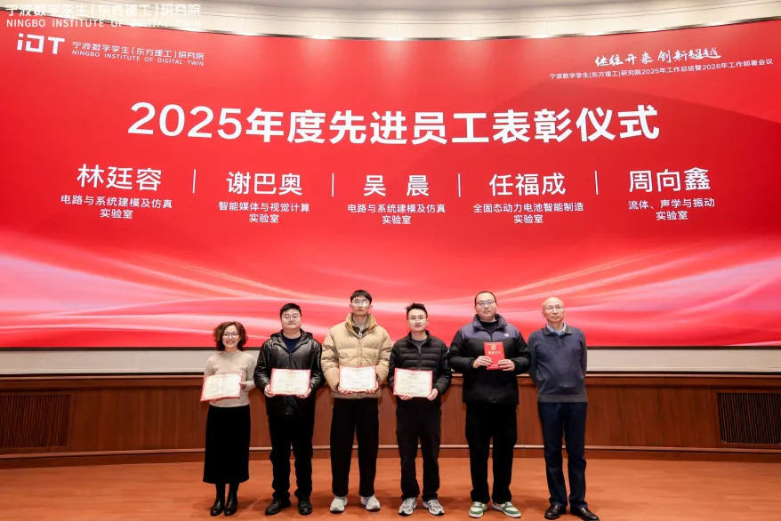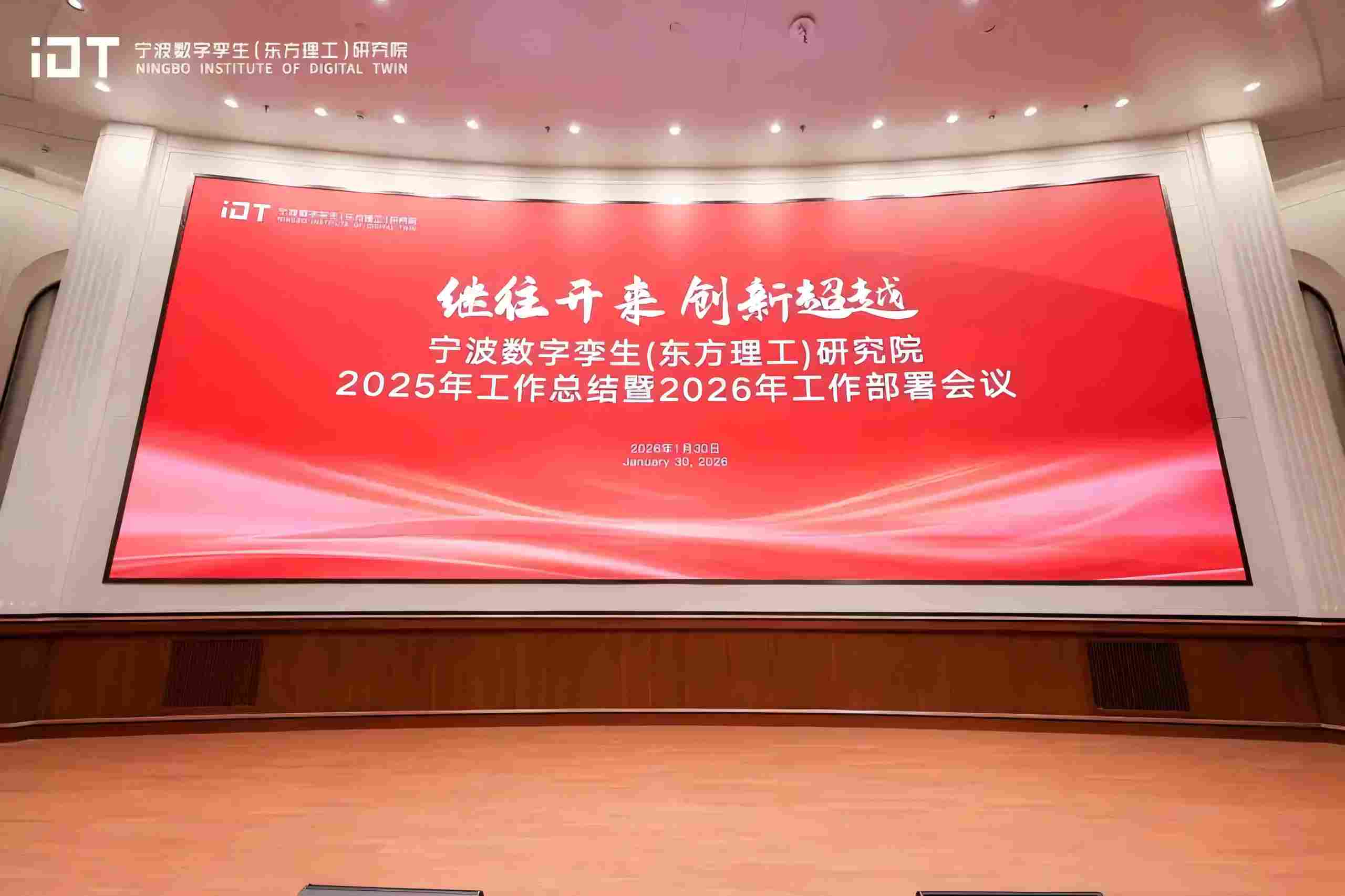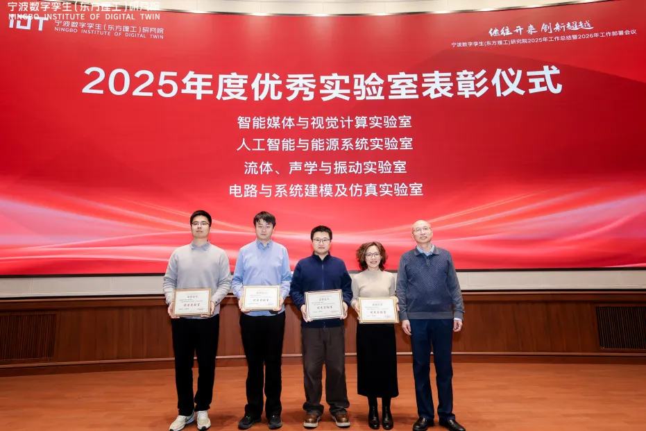2026年1月30日下午,宁波数字孪生(东方理工)研究院召开2025年度总结表彰暨2026年工作部署大会。会议全面回顾了过去一年的奋斗历程与创新成果,分享了丰收喜悦,表彰了先进典型,也战略部署了新一年的发展方向与重点任务。全院员工齐聚一堂,共话发展,共谋未来。执行院长曾文军院士,副院长郭国栋、唐湘民出席会议。院长助理鲍淑娣主持。